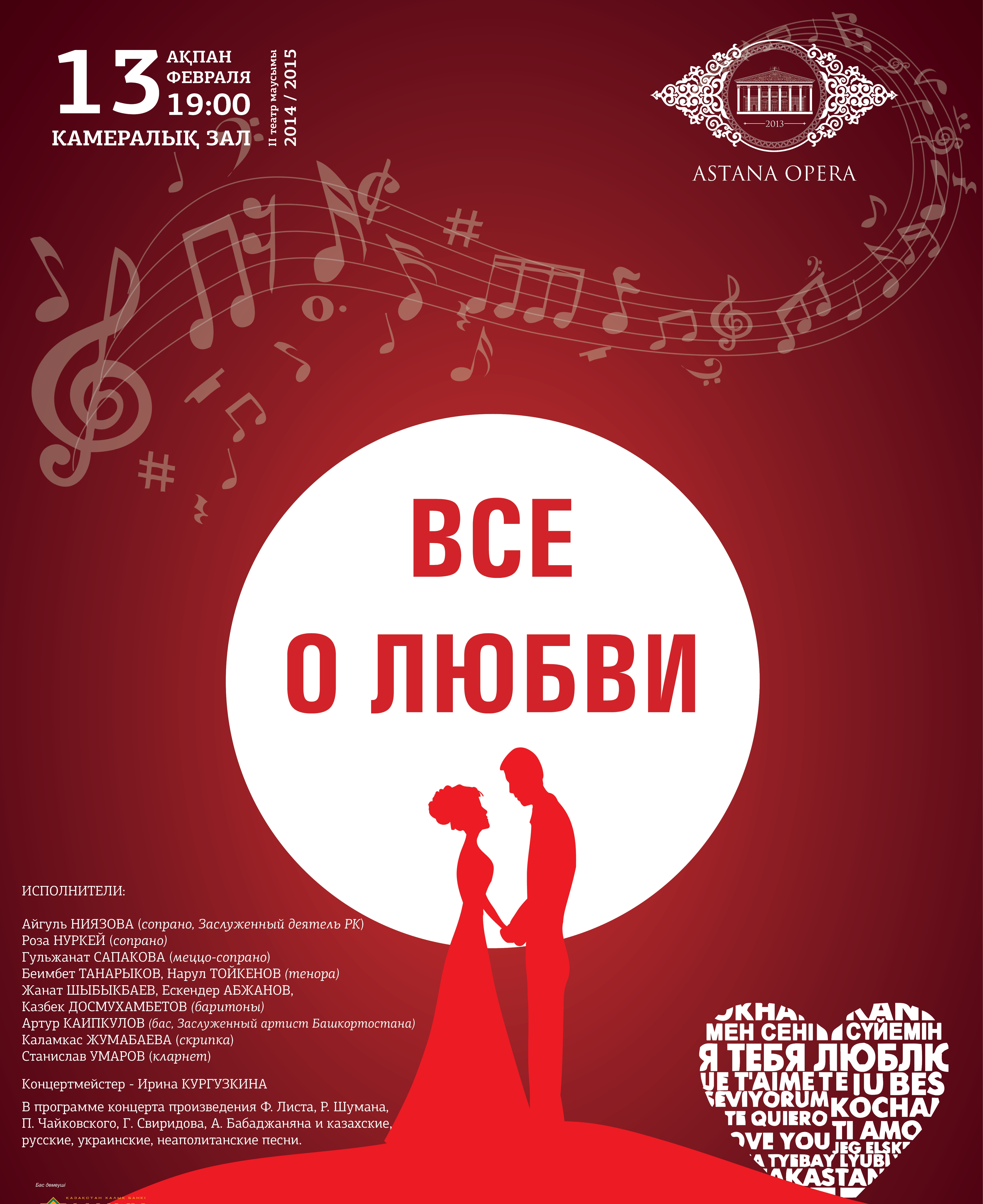 В Камерном зале театра "Астана Опера" пройдет концерт "Все о любви", приуроченный ко Дню всех влюбленных, сообщает корреспондент Tengrinews.kz.