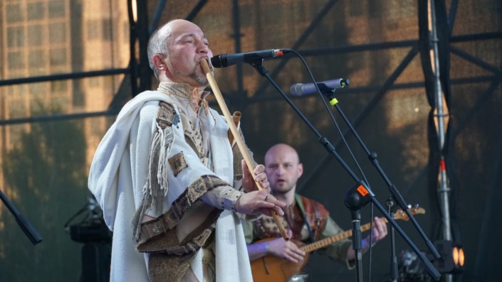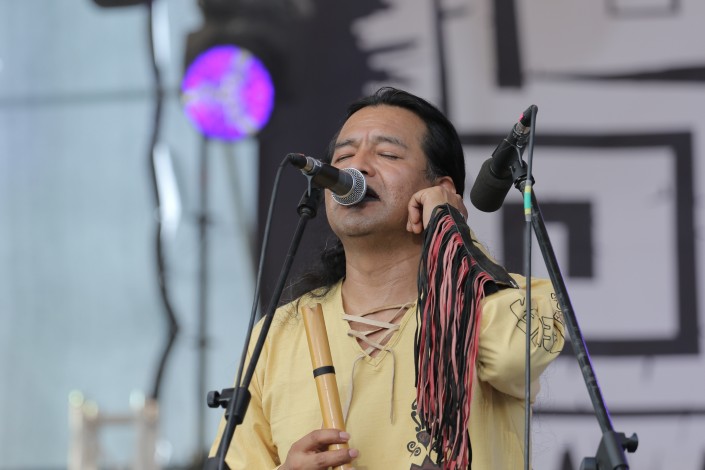 19.30 Музыканты удивили зрителей не только необычным стилем одежды, но и виртуозной игрой флейты, которая прекрасно гармонировала с родовыми барабанами и электрогитарой. В данном проекте участвуют этнические индейцы, которые в своих композициях обыгрывают древнеиндейские мотивы в современной обработке.