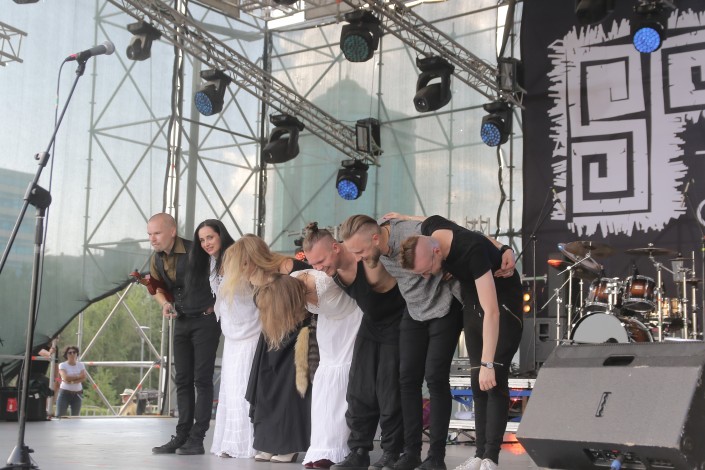 19.00 Потрясающее треголосие и энергичные барабанные партии группы из Литвы начали по настоящему раскачивать атмосферу. Гости фестиваля стали сначала пританцовывать, а потом и танцевать в полную силу.