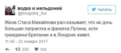 В разговоре с Тимуром востребованный артист несколько раз повторил, что любит Россию, а у его дочерей "нет другого предназначения", кроме как "вырасти настоящими женщинами, уметь готовить и состояться как жена и мать". В завершение передачи Михайлов подарил Кизякову икону и дорожную Библию. Тимур не остался в долгу и пожелал Стасу и его жене столько детей, сколько сможет позволить здоровье.