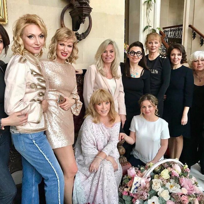 В доме певицы собрались композитор Игорь Николаев с женой певицей Юлией Проскуряковой, актриса Олеся Судзиловская, дизайнер Валентин Юдашкин с женой Мариной, дочь Кристина Орбакайте с мужем Михаилом Земцовым и детьми Дени Байсаровым, Никитой Пресняковым и Клавдией Земцовой.