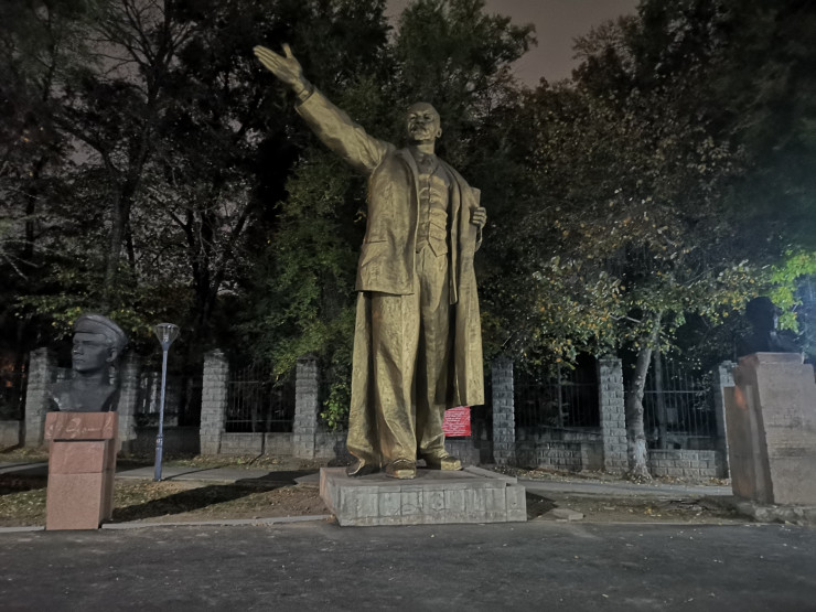 Осталась последняя и самая крупная точка нашего маршрута. Это сквер за кинотеатром "Сары-Арка" на пересечении проспектов Абая и Алтынсарина, который является последним пристанищем для памятников Владимиру Ленину, Михаилу Фрунзе, Максиму Горькому, Михаилу Калинину, борцам Октябрьской революции, Павлу Виноградову и Дмитрию Фурманову. Они все когда-то возвышались на алматинских улицах.