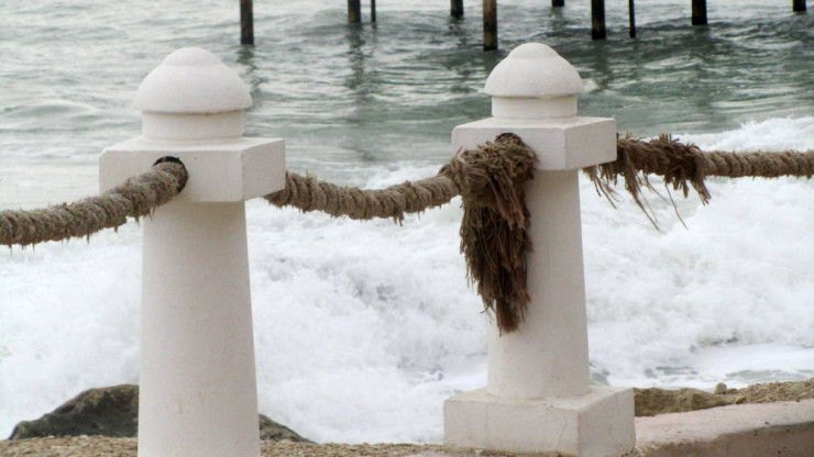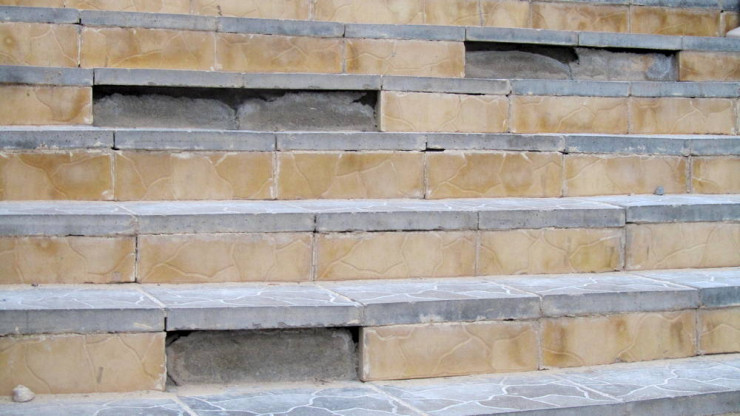 Изношено канатное ограждение, плитка на некоторых ступенях отвалилась.