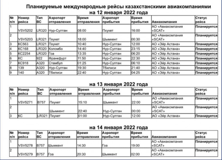 Итого по Казахстану планируется выполнение 35 рейсов и отменено 20 рейсов.