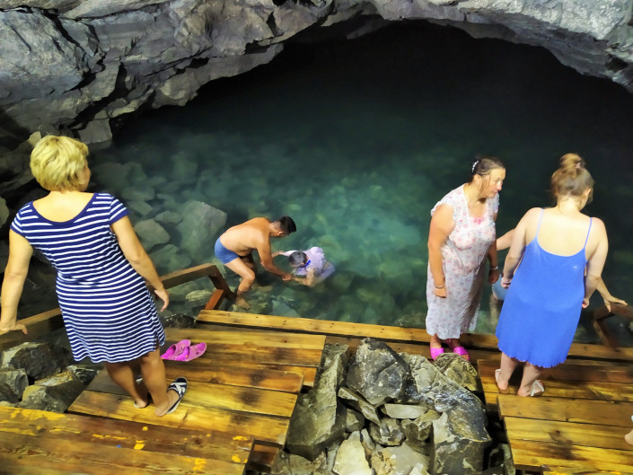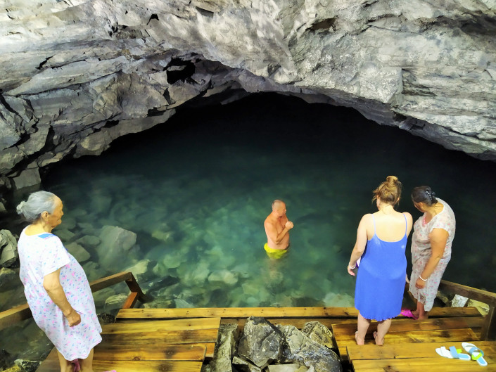Люди окунаются в воду и сейчас, веря в ее особые целебные свойства. Вода настолько холодная, что конечности может сразу стянуть судорогой и нестерпимо ломит кости ног. Но обряд требует, окунаться в воду нужно не менее трех раз. Желательно семь. Удивительно, но среди туристов мало кто отказывается. Купаются в одежде, и согласно той же традиции одежду эту не сушат. Одежда, как и тело, должны высохнуть сами, дабы впитать в себя все целебные свойства воды. Удивительно то, что за несколько раз посещений этой пещеры мы ни разу не видели заболевших и почувствовавших себя плохо людей. А ведь температура в пещере всего семь градусов, а воды и того меньше, +4. Видимо, самовнушение, поскольку каждый окунающийся в озере идет с мольбами к Всевышнему, загадывает желание и искренне верит, что его мольбы и желания исполнятся.
