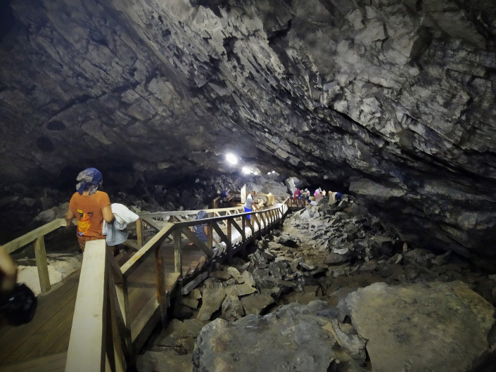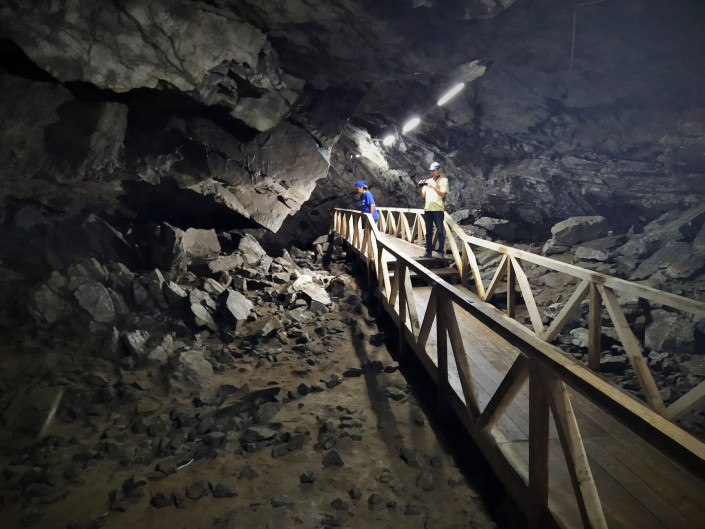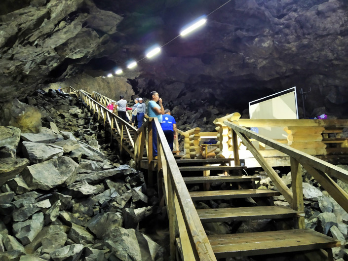 Вход в пещеру и ее основание не всегда были покрыты такими валунами. Когда ее исследовали путешественники в начале ХХ века, то писали, что в пещере ровная поверхность - песчаная, за которой лежит озеро. Эти валуны, лежащие теперь на поверхности, - результат постоянного сотрясения почвы от ядерных испытаний. Проводились они сравнительно недавно в 70 километрах от пещеры. Постоянные искусственные землетрясения приводили к тому, что от верхних сводов пещеры отваливались камни и падали, отсюда такое хаотичное нагромождение под ногами валунов.