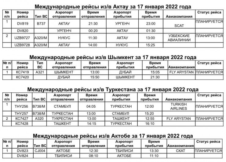 17 января 2022 года из/в Нур-Султан планируется выполнение 23 международных рейсов в Москву, Стамбул, Дубай, Варшаву, Жуковский, Екатеринбург, Ташкент, Франкфурт и обратно.