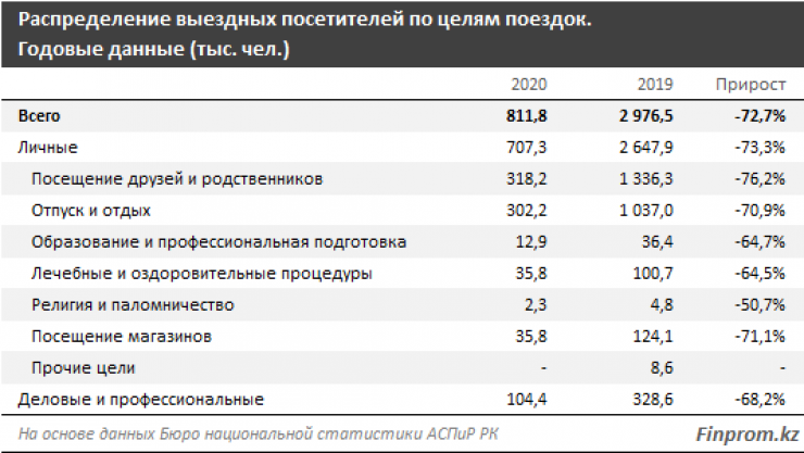В 2020 году за пределами страны путешествовали всего 811,8 тысячи казахстанцев - в 3,7 раза меньше, чем в предыдущем году. В поездки с личными целями отправились 707,3 тысячи человек, 318,2 тысячи человек имели цель посетить друзей и родственников, а 302,2 тысячи человек отправились на отдых.