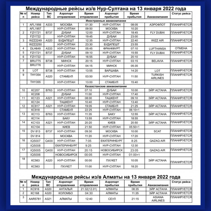 Информация по Алматы готовится. Итого по РК планируется выполнение 63 рейсов и отменен один рейс.