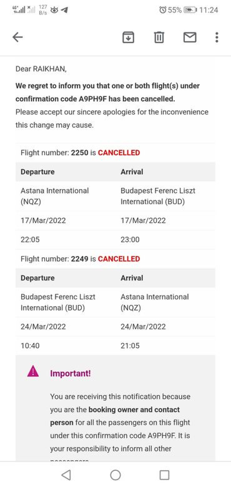 До последнего времени Wizz Air была единственной авиакомпанией, совершавшей полеты из Казахстана в Венгрию, но в начале прошлого месяца пассажирам, купившим билеты на март 2022 года, пришло уведомление об отмене рейсов. При этом в социальных сетях и на официальном сайте компания не сообщала о закрытии направления или о временном приостановлении полетов по направлению Нур-Султан - Будапешт. Пассажирам в соцсетях предлагалось обратиться в частном порядке, заполнив специальную форму.