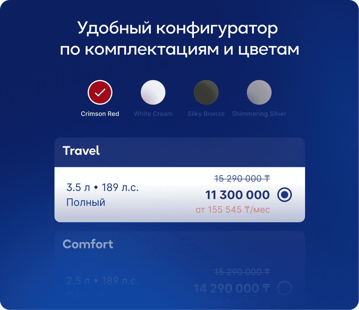 - Выберите автомобиль, цвет, комплектацию и удобный способ оплаты