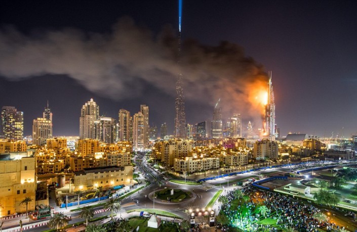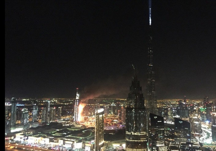 В Дубаи празднование Нового года вечером 31 декабря омрачилось сильным пожаром в пятизвездочном отеле-небоскребе Address Downtown, который расположен рядом с самым высоким зданием в мире - башней Бурдж Халифа. Фотографии и видео с места события очевидцы инцидента публикуют на своих страницах в социальных сетях - Twitter, Instagram, Facebook, сообщает Tengrinews.kz.