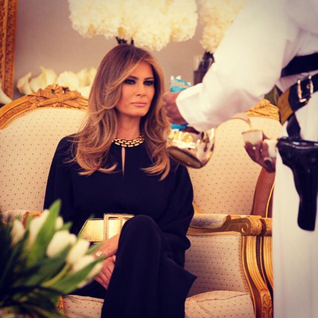 При этом первая леди Америки и ее дочь приехали на встречу в консервативной одежде, учитывая дресс-код в мусульманской стране. Меланья была одета в костюм-комбинезон с золотым широким поясом, который полностью закрывал руки и ноги. На Иванке было длинное черное платье с красно-белым цветочным рисунком и длинными рукавами.