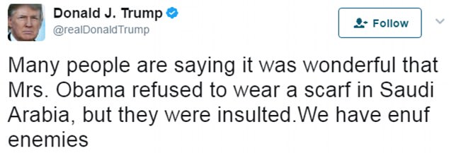 Дело в том, что в 2015 году Дональд Трамп в Twitter осудил Мишель Обаму за непокрытую голову во время визита с Бараком Обамой в Эр-Рияд. "Многие говорят, что это здорово, что миссис Обама отказалась надеть платок в Саудовской Аравии. Но они обиделись. А у нас и так достаточно врагов", - написал тогда Трамп.