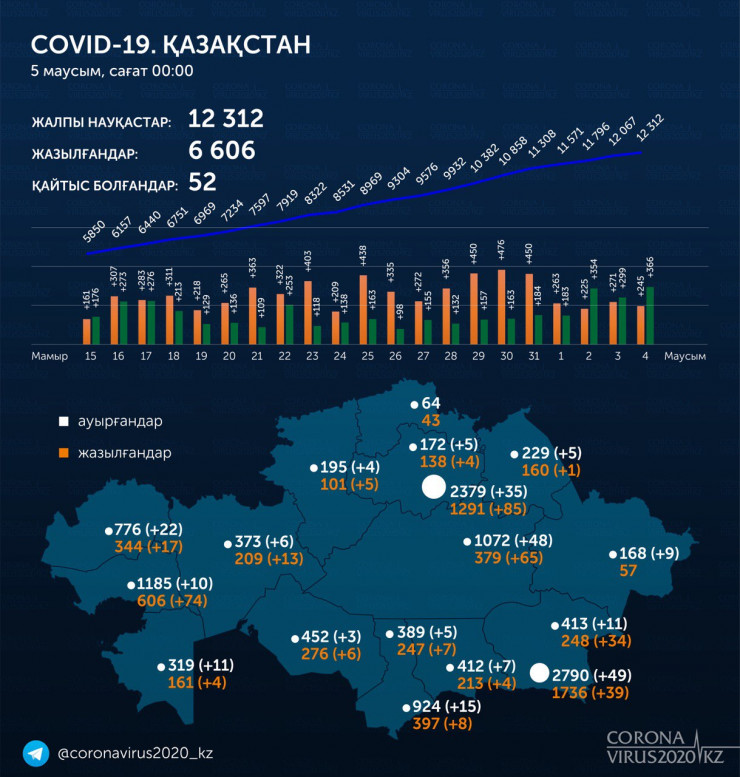 Всего в стране выявлено 12 312 заболевших коронавирусом, число выздоровевших пациентов увеличилось до 6606 человек. 52 летальных случая от COVID-19.
