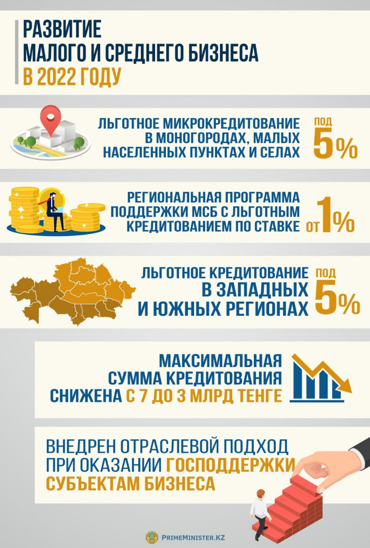 В текущем году был принят и ряд других мер по развитию предпринимательства. Так, внедрено льготное микрокредитование под 5 процентов в моногородах, малых населенных пунктах и селах, запущена региональная программа поддержки МСБ с льготным кредитованием по ставке от 1 процента, а также начало действовать льготное кредитование под 5 процентов для западных и южных регионов. Вместе с тем была снижена максимальная сумма кредитования с 7 до 3 миллиардов тенге, что позволило увеличить охват субъектов бизнеса мерами господдержки, и внедрен отраслевой подход при ее оказании.
