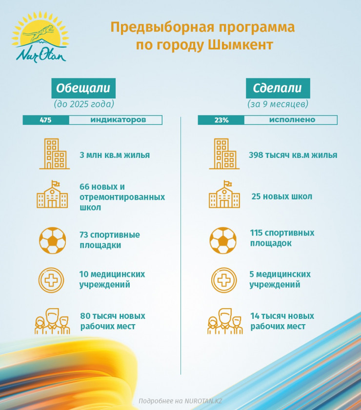 По информации председателя филиала, акима Шымкента Мурата Айтенова, за 9 месяцев исполнено 23 процента из 475 индикаторов, запланированных до 2025 года. В городе уже построено 398 тысяч квадратных метров жилья, 5 медицинских учреждений и 115 спортивных площадок. Построена электроподстанция "Бозарык" в целях бесперебойной подачи электроэнергии для 250 тысяч человек. Завершается строительство газораспределительной станции, что обеспечит природным газом 5 отдаленных населенных пунктов. Создано свыше 14 тысяч новых рабочих мест.