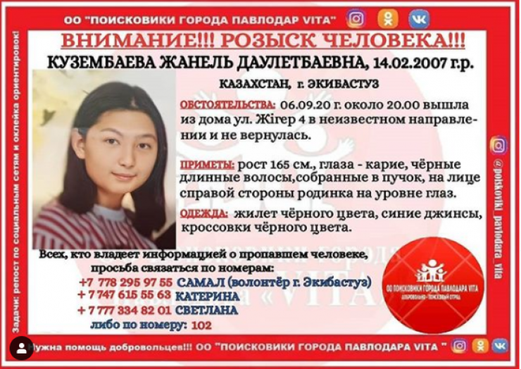 С заявлениями в полицию обратились родители подростков. Ориентировки на пропавших Жанель Кузембаеву и Дастана Исабекова волонтеры разместили в Instagram.