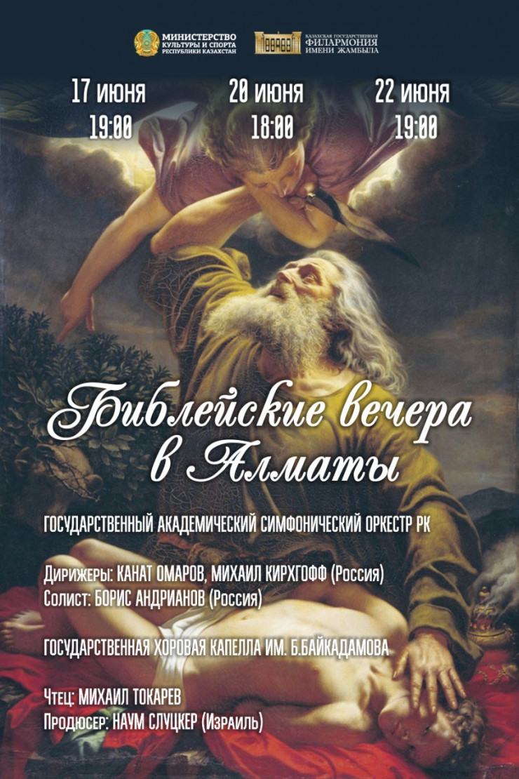 22 июня в 19.00 прозвучит Моцарт - Симфония № 25 и Оратория "Авраам" Берлинера для чтеца, хора и симфонического оркестра в пяти частях. В центре произведения Авраам - центральный библейский персонаж. Оратория рассказывает о жизни Авраама, о его пути и его бескомпромиссной вере в Бога. Примечательно, что этот персонаж встречается во всех центральных религиях мира: в исламе - Ибрагим, в христианстве - Авраам, в иудаизме - Avraham. Государственный академический симфонический оркестр РК. Дирижер: Канат Омаров. Государственная хоровая капелла имени Байкадамова. Художественный руководитель: Беймбет Демеуов. Текст читает заслуженный артист РК Михаил Токарев.