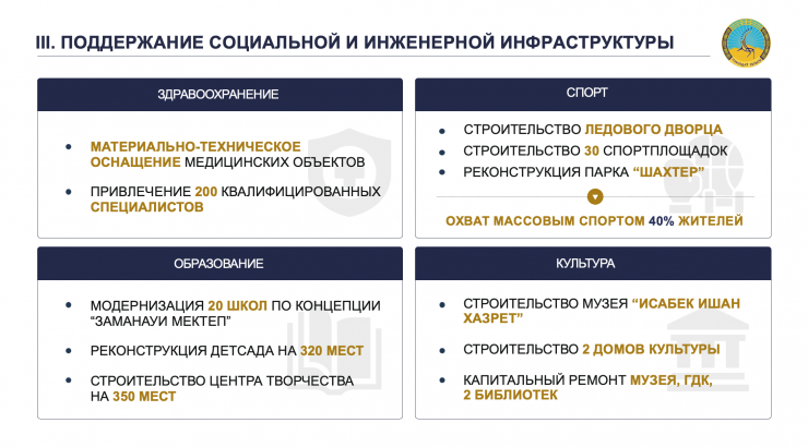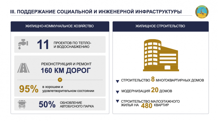 "Мы отчетливо понимаем, что без улучшения условий жизни людей нельзя говорить о процветании города. Если на другие блоки КПР в основном пойдут частные инвестиции (частные инвестиции составят 89,5 процента средств для реализации КПР – прим. автора), то на вопросы ЖКХ и соцсферы направим преимущественно средства из местного бюджета. В КПР 11 проектов по водо- и теплоснабжению, реконструкция более 160 километров дорог, строительство 200 тысяч квадратных метров жилья, капитальный ремонт 20 школ, строительство объектов дополнительного образования, культуры, спорта и другое", - написал Абылкаир Скаков.