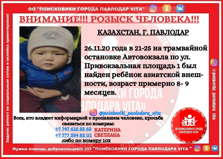 "Ребенок в возрасте 8-10 месяцев азиатской внешности найден примерно в половине десятого вечера рядом с трамвайной остановкой на привокзальной площади", - сообщила волонтер общественного объединения "Поисковики Павлодара Vita" Екатерина Кудрявцева.