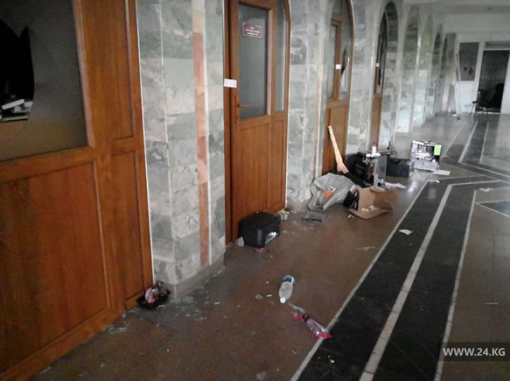 Во всех помещениях царит хаос. Добровольцы со всего Кыргызстана продолжают охранять здание от мародеров.