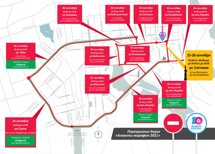 Старт и финиш марафона будут на площади Республики, поэтому по улице Сатпаева от улицы Желтоксан до проспекта Назарбаева будут перекрыты обе полосы движения с 6.00 25 сентября до 18.00 26 сентября.