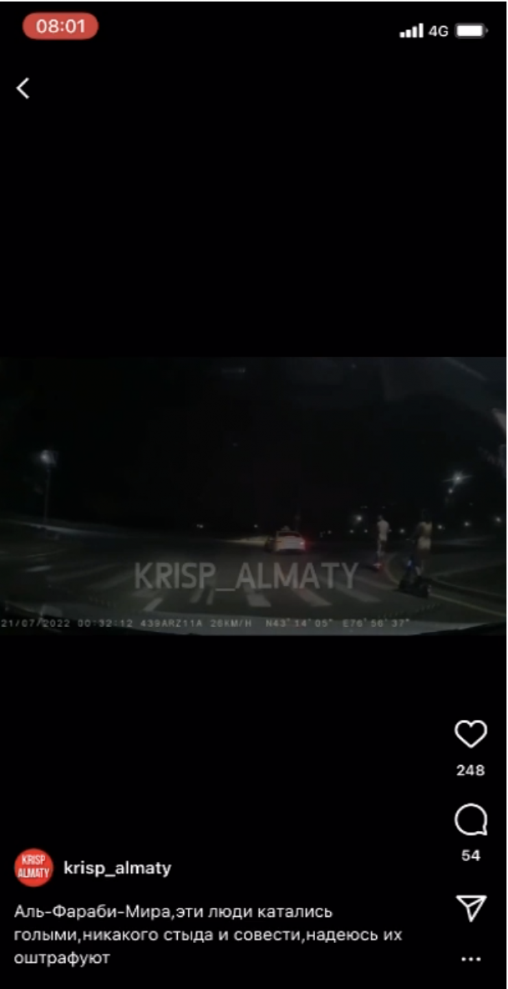 "Аль-Фараби - Мира, эти люди катались голыми, никакого стыда и совести, надеюсь, их оштрафуют", - написал автор.
