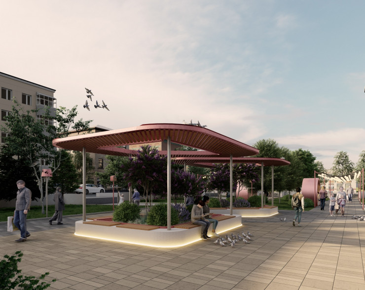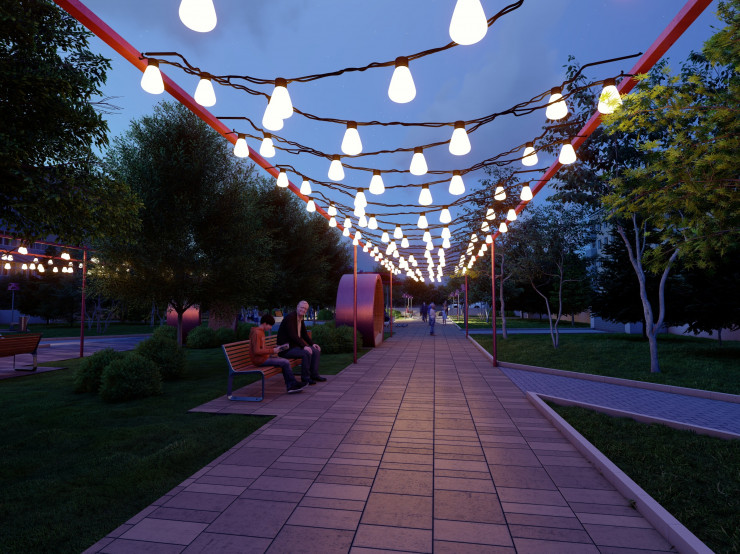 Освещение входной группы планируется оформить гирляндами. По всей территории сквера будут установлены тематические торшеры. Вдоль тротуаров появятся скамейки и лежаки. Также в центре сквера планируется расположить теневой навес с клумбой озеленения. Дополнительно будут высажены деревья на пустующих территориях общественного пространства.
