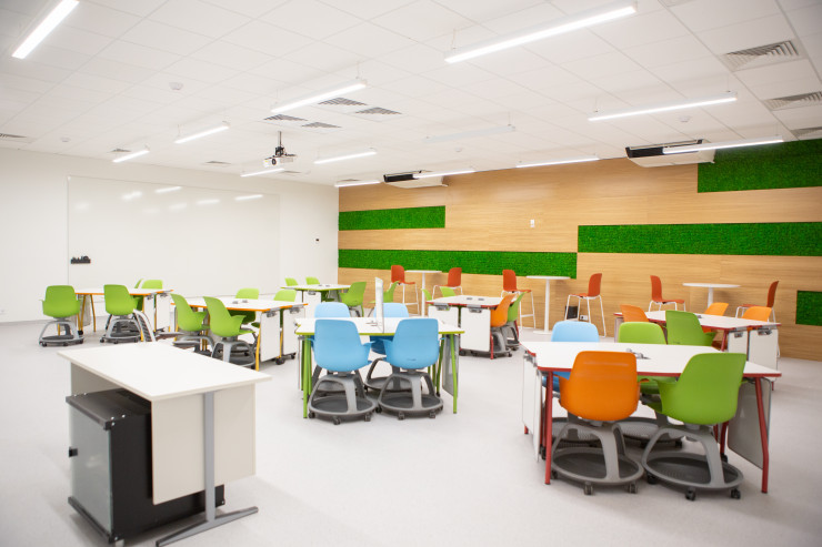 Реконструкцию главного учебного корпуса университета общей площадью 30 тысяч квадратных метров закончили в рекордные 11 месяцев. Его главная особенность – ориентация на устойчивое развитие: при строительстве использовались современные экологичные технологии, материалы и оборудование, на всей территории здания высажены более 30 тысяч зеленых насаждений. Применение передовых зеленых решений в строительстве позволило значительно сократить выбросы вредных веществ на всей территории кампуса, а благодаря внедрению энергосберегающих осветительных приборов экономия энергии ежегодно составит около 120 тысяч киловольт. Всего в новом кампусе насчитывается более 26 IT-лабораторий, 112 аудиторий и 115 рабочих зон в формате open space. Для удобства студентов и преподавателей на территории учебного корпуса круглосуточно и без выходных функционирует современная библиотека, а для иностранных студентов предусмотрен отдельный офис – welcome center.