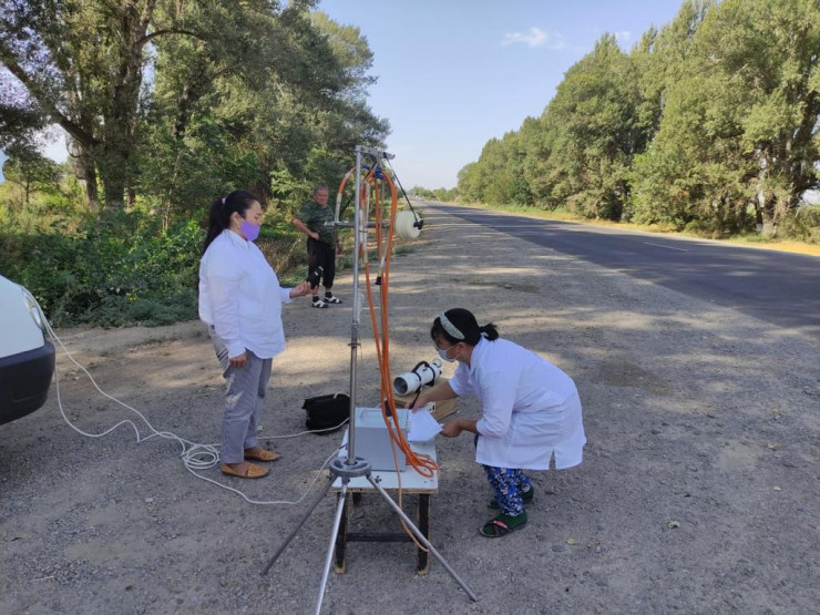 По причине возгорания склада боеприпасов 26 августа 2021 года в 19.10 часов, расположенного в Байзакском районе, сотрудники лаборатории филиала Казгидромета по Жамбылской области выехали в Байзакский район для выполнения внепланового отбора и анализа проб атмосферного воздуха.