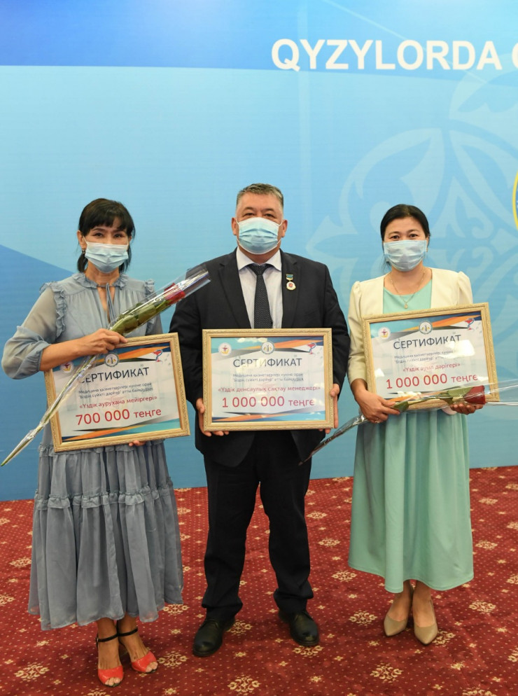 Кроме того, 7 медицинских сотрудников были награждены Благодарственным письмом акима области, 13 специалистов - нагрудным знаком "Денсаулық сақтау ісінің үздігі", 11 специалистов - нагрудным знаком "Денсаулық сақтау ісіне қосқан үлесі үшін". На торжественном собрании также оказали почет победителям конкурса "Наш любимый врач – 2021". В номинации "Лучший менеджер здоровья" был награжден главный врач областного центра психического здоровья Адильбай Медетбаев, в номинации "Лучший врач больницы" - врач Аральской межрайонной больницы Гульжанат Тулепова. Обладателям наград был вручен денежный сертификат на сумму в 1 миллион тенге. Медсестра многопрофильной городской больницы Раушан Томанова признана достойной номинации "Лучшая медицинская сестра больницы" и получила денежное вознаграждение в размере 700 тысяч тенге.