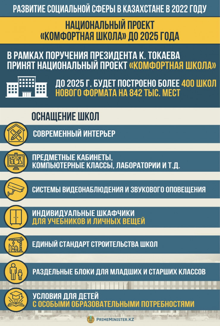 В этом году по поручению Президента принят национальный проект "Комфортная школа". В рамках него до 2025 года планируется построить более 400 школ абсолютно нового формата на 842 тысячи мест, которые будут полностью оснащены необходимым учебным оборудованием, предметными кабинетами, компьютерными классами, лабораториями и мастерскими, системами видеонаблюдения и звукового оповещения, индивидуальными шкафчиками для детей и так далее.