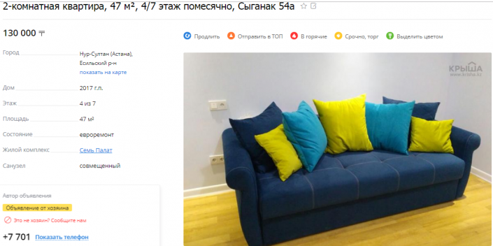 Двухкомнатная в Нур-Султане. Дом 2017 года постройки. Скриншот с сайта "Крыша".