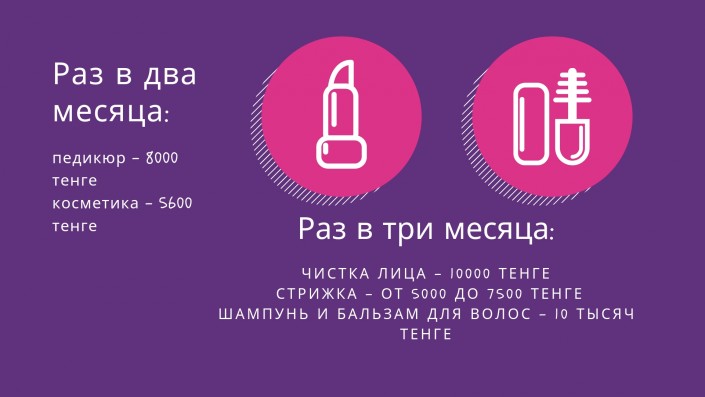Ежемесячно: маникюр - 10 000 тенге; депиляция - 5 000 тенге