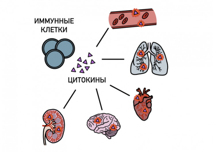 Одним из механизмов развития COVID-19 является так называемый цитокиновый шторм. Он связан с тем, что система иммунной защиты вырабатывает огромные количества молекул, называемых цитокинами. Они вызывают многочисленные нарушения в организме. Поведение иммунной системы во время цитокинового шторма напоминает заклинивание газовой педали автомобиля, из-за чего он сильно разгоняется, теряя способность остановиться, и может вести к катастрофе.