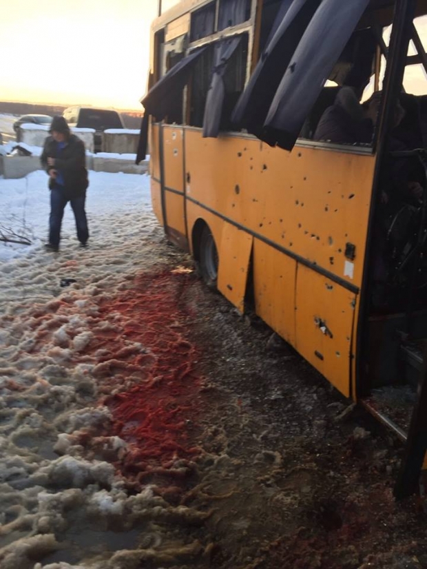 11 пассажиров погибли при обстреле автобуса под Донецком Возле обстрелянного автобуса лужи крови. © Пресс-служба Генштаба Украины