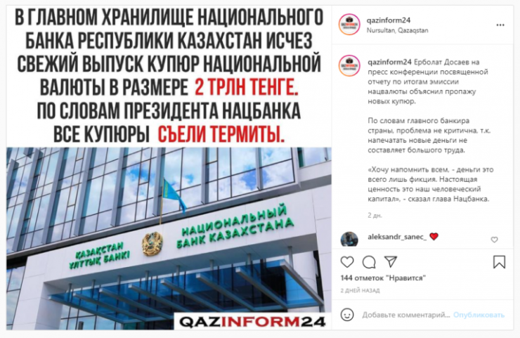 В социальных сетях и мессенджерах казахстанцы рассылают новость о том, что "в главном хранилище Национального банка Республики Казахстан термиты съели свежий выпуск купюр национальной валюты в размере двух триллионов тенге". Сайт Stop Fake назвал сообщение ложным и объяснил, где "родился" очередной фейк, передает Tengrinews.kz.