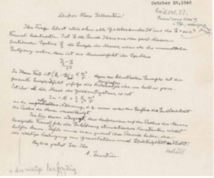 В письме Эйнштейн заявил адресату, что на его вопрос можно ответить формулой E=mc2, "без всякой эрудиции". Он написал эти слова на бланке Принстонского университета.