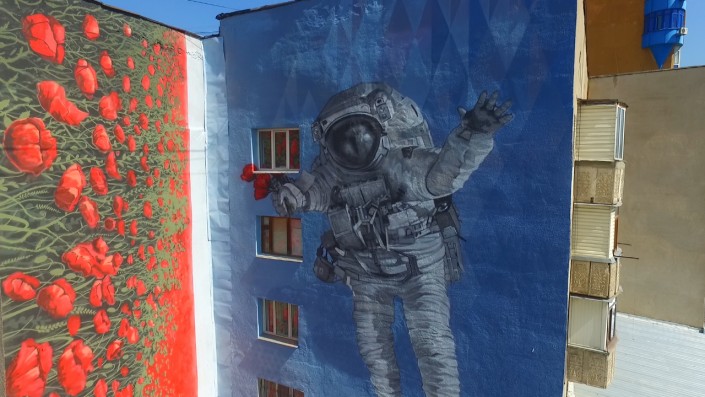 Московский граффити-художник, известный как Zmogk, украсил стену одного из домов портретом казахской девушки и символом города - барса. В своих работах он предпочитает яркие цвета, динамику и некоторый хаос.