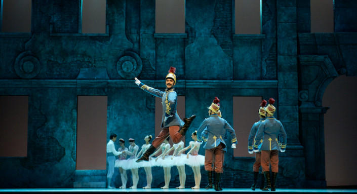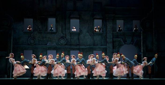Герои были представлены в начале спектакля в воинской части, декорации которой соответствовали аскетичной жизни солдат. Молодые жительницы города флиртовали с бравыми военными и кружились в массовом легком и непринужденном танце. Нарядные костюмы, выполненные в розовых и голубых тонах выдающимися художниками Эцио Фриджерио и Франкой Скуарчапино, привлекли всеобщее внимание публики. На фоне серой казармы развлекательная затейливость танца казалась очень эффектной.