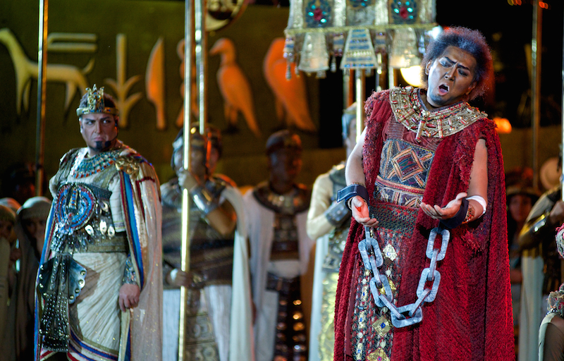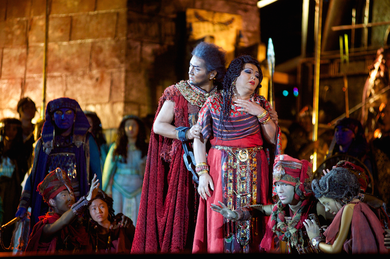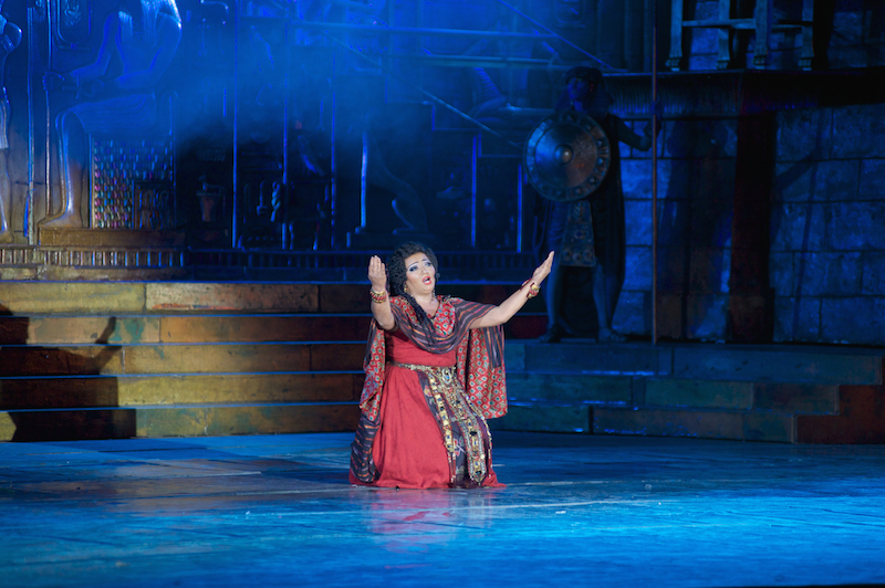 Роскошные декорации, созданные по эскизам выдающегося сценографа и режиссера Франко Дзеффирелли, дополнили гигантские видеоинсталляции. Также во время оперы были использованы специальные световые эффекты. А финал сцены триумфа Радамеса завершился грандиозным фейерверком в честь праздника.