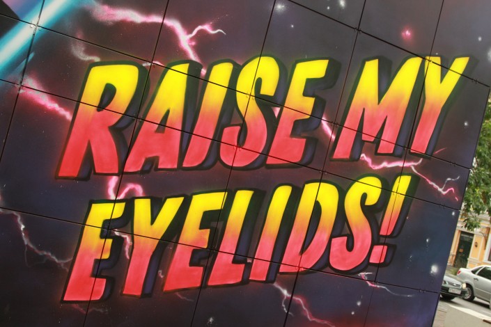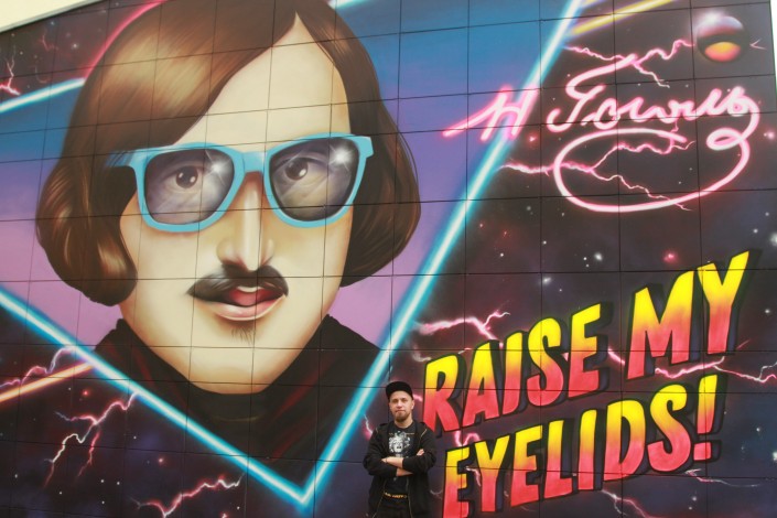 "При создании работы смиксован классический портрет Гоголя с тематикой ретровейв - стилистику 80-х отличают неоновые краски. Надпись "Raise my eyelids" - это цитата "Поднимите мои веки" из гоголевской мистической повести "Вий". На создание граффити ушло 300-400 баллончиков специализированной аэрозольной краски. Я совмещал российскую краску с европейской - в одной линейке не было всех нужных цветов. Сложностей не было, кроме погодных условий. Я зафиксировал лаком, чтобы держалось максимально долго. Так как граффити нанесено на плитку, а это очень капризный материал, вероятно, продержится от года до пяти лет", - уточняет автор идеи.
