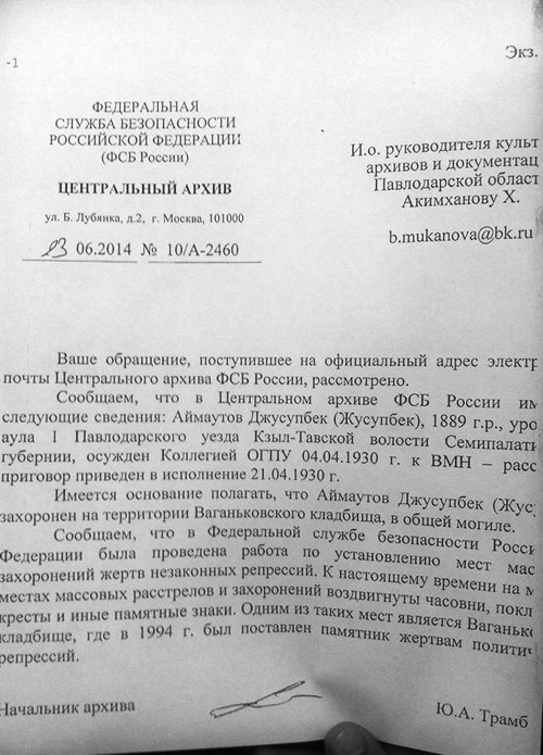 По данным акимата, о месте захоронения Жусипбека Аймауытова до сих пор не было ничего известно. "Из официального ответа ФСБ РФ следует, что он был осужден коллегией ОГП к высшей мере наказания, исполненной 21 апреля 1930 года. В этом же письме указывается, что есть основания полагать, что Жусипбек Аймауытов захоронен в Москве на территории Ваганьковского кладбища в общей могиле", - рассказал пресс-секретарь акима области Аскар Джалдинов. "В архивных документах говорилось только о том, что известный казахстанский классик был репрессирован и убит в 1930 году. Но где именно его похоронили, никто толком не разбирался и не выяснял", - рассказал представитель ведомства.