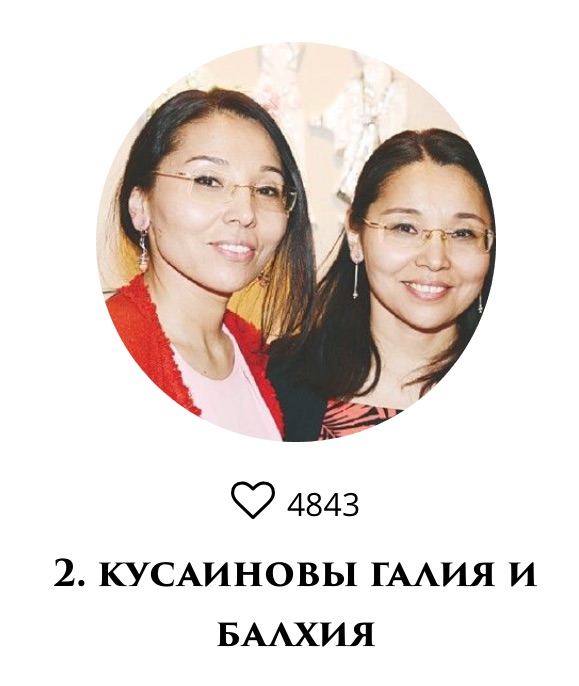 На втором месте сестры-близнецы Галия и Балхия Кусаиновы, родились 29 октября 1969 года. С 2003 года - члены Союза художников Казахстана.
