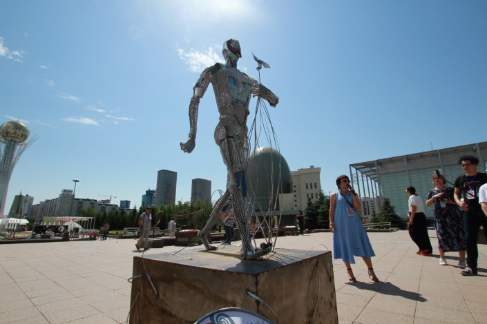 Автор этой кинетической скульптуры "Под вечным небом" Ермек Аркаров изобразил в своем творении солнцеликого человека. "Это образ Тенгри - бога кочевников. Здесь можно увидеть цепочку из природы, животных, которые становятся одной линейной. Художник также пытается передать, что современное искусство за счет кинетики может внедриться в архитектуру города", - рассказала куратор раздела современного искусства Аида Адильбекова.