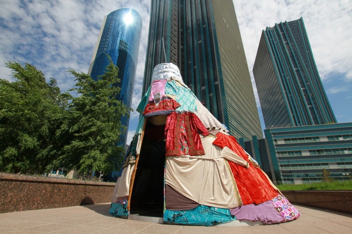 Гульмарал Татибаева в своем творении изобразила из халатов архитектуру астанинского "Хан-шатыра". Также арт-объект напоминай казахский женский головной убор - саукеле.