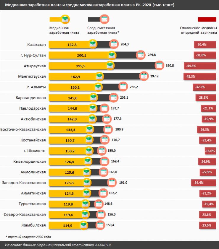 По регионам разрыв между медианным и средним значением зарплаты отличается и колеблется от 16 до 45 процентов. К примеру, в Нур-Султане медианная заработная плата составила 289,8 тысячи тенге, это на 31 процент меньше, чем средняя зарплата в регионе.