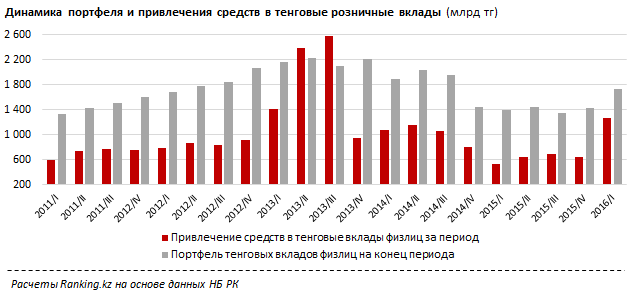 "Всего за январь-март 2016 года в тенговые депозиты физлиц был привлечен 51 процент всей суммы привлечения за 2015 год. На этом фоне совокупный размер портфеля розничных вкладов, номинированных в тенге, за год увеличился на 23 процента, до 1,7 триллиона тенге. Концентрация рынка розничных тенговых вкладов последние два года увеличилась, порядка 40 процентов рынка формируется двумя крупнейшими банками в сегменте - Жилстройсбербанк и Народный банк", - пояснили аналитики.