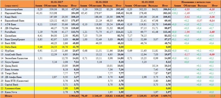 "Несмотря на то, что портфель ГЦБ иностранных государств вырос только на 36,1 миллиарда тенге, до 984,9 миллиарда тенге, его структура претерпела достаточно ощутимые изменения. Инвестиции в ГЦБ США сократились на 88,5 миллиарда тенге, до 539,4 миллиарда тенге. К слову, за январь доходности 10-летних и 30-летних "трежерис" выросли на 0,31 процента и 0,2 процента соответственно. Средства ЕНПФ были инвестированы в государственные облигации Польши (16,2 миллиарда тенге) и ряда развивающихся стран: Индонезии (48,4 миллиарда тенге), Мексики (43,5 миллиарда тенге), Филиппин (16,1 миллиарда тенге), Чили (4,9 миллиарда тенге) и Перу (1,8 миллиарда тенге). Наблюдается прирост по депозитам в иностранных банках с 277,4 миллиарда тенге до 409,9 миллиарда тенге.